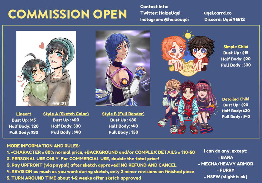 Here is my commission sheet. Feel free to contact me on either my social medias if you're interested! :)